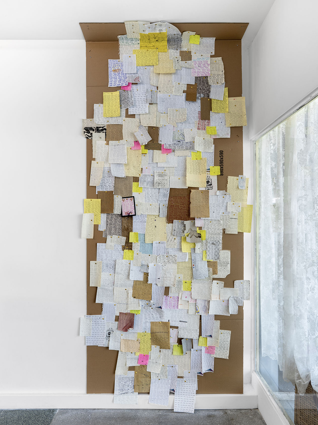 found paper, corrugated cardboard, pins