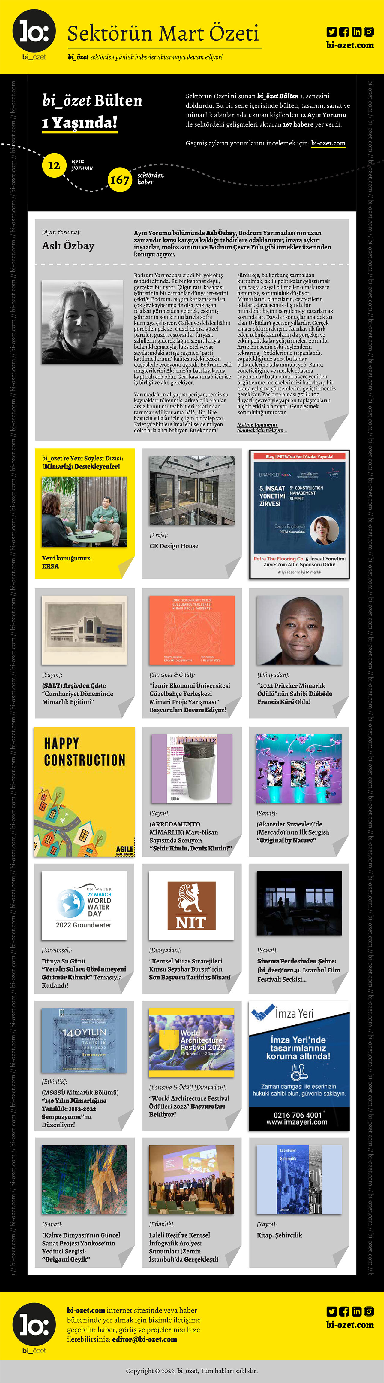 In 2022 they commissioned me for the design of bi-özet’s monthly newsletter that would be regularly sent to their subscribers. The newsletter – a new initiative – was intended to include a categorical summary of all the news in related fields, plus a monthly commentary on architecture at the top. Besides, I was also tasked with designing a new logo and amblem for the newsletter along with template variations for different media.