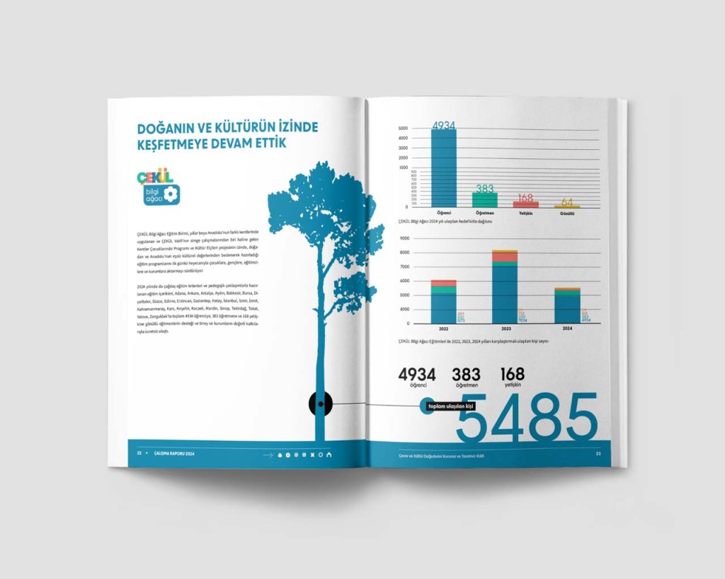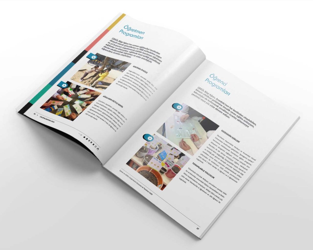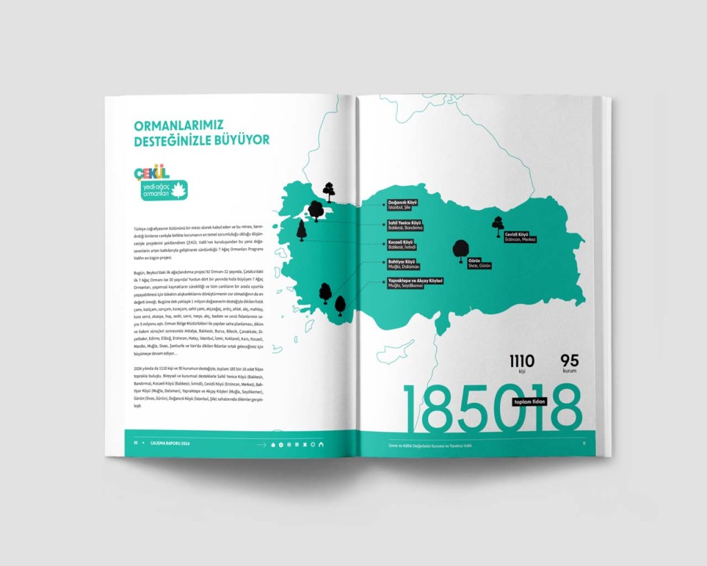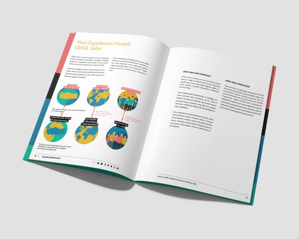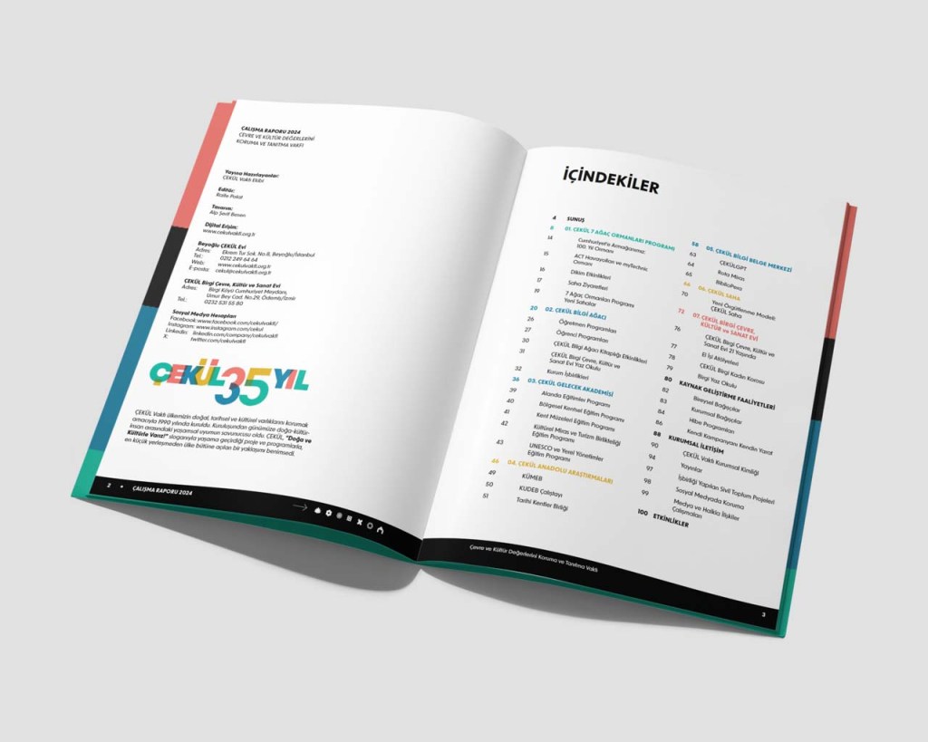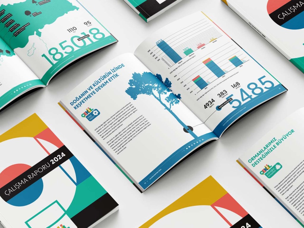 Each year ÇEKÜL publishes a report on their yearly activities. Having only recently redesigned their corporate identity, they commissioned me to design two separate yet related things. First, they wanted me to prepare the 2024 Activities Report aligned with their already in-use corporate identity, and second they wanted it to work as a template for all future publications.
